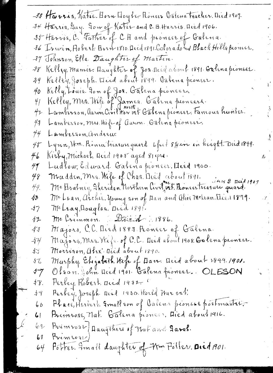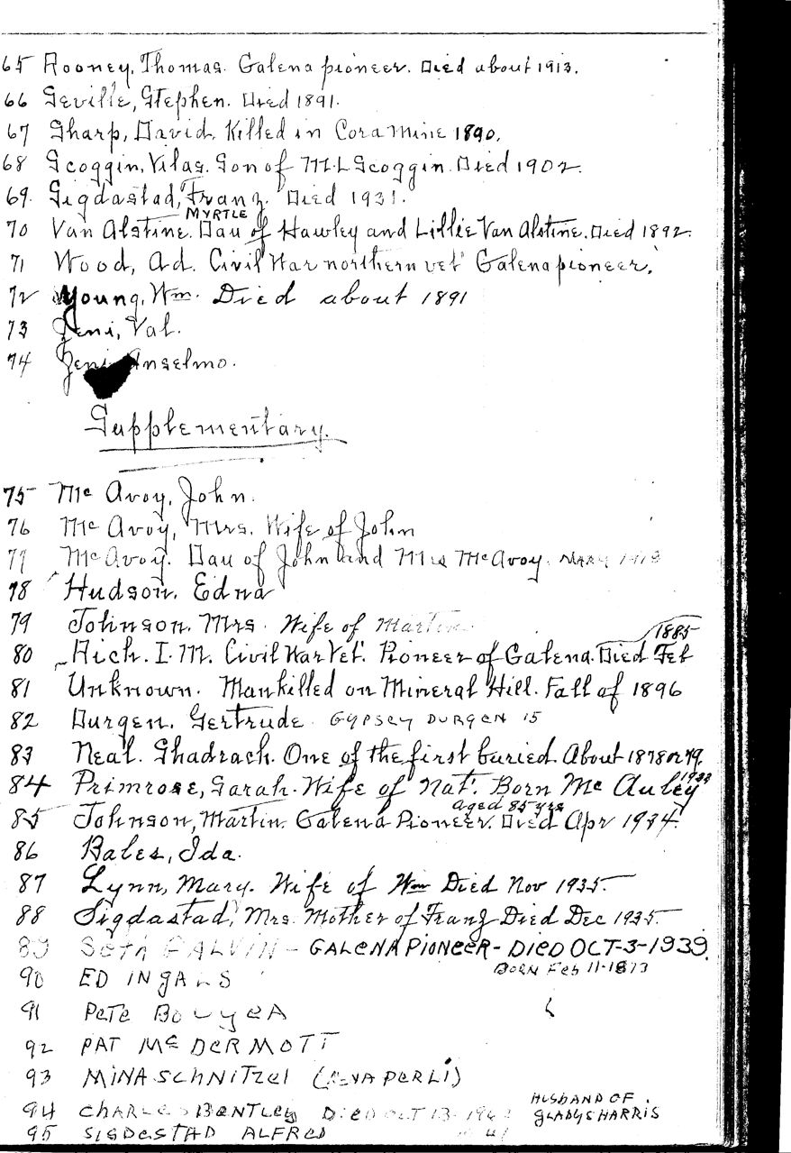 ![]() The Galena Cemetery is on Vinegar Hill in the northwest part of town, up a steep road. Below are links to pages that list who is in the cemetery, as best as is known. The Roubaix cemetery also holds Galena natives. cemetery view from above here.